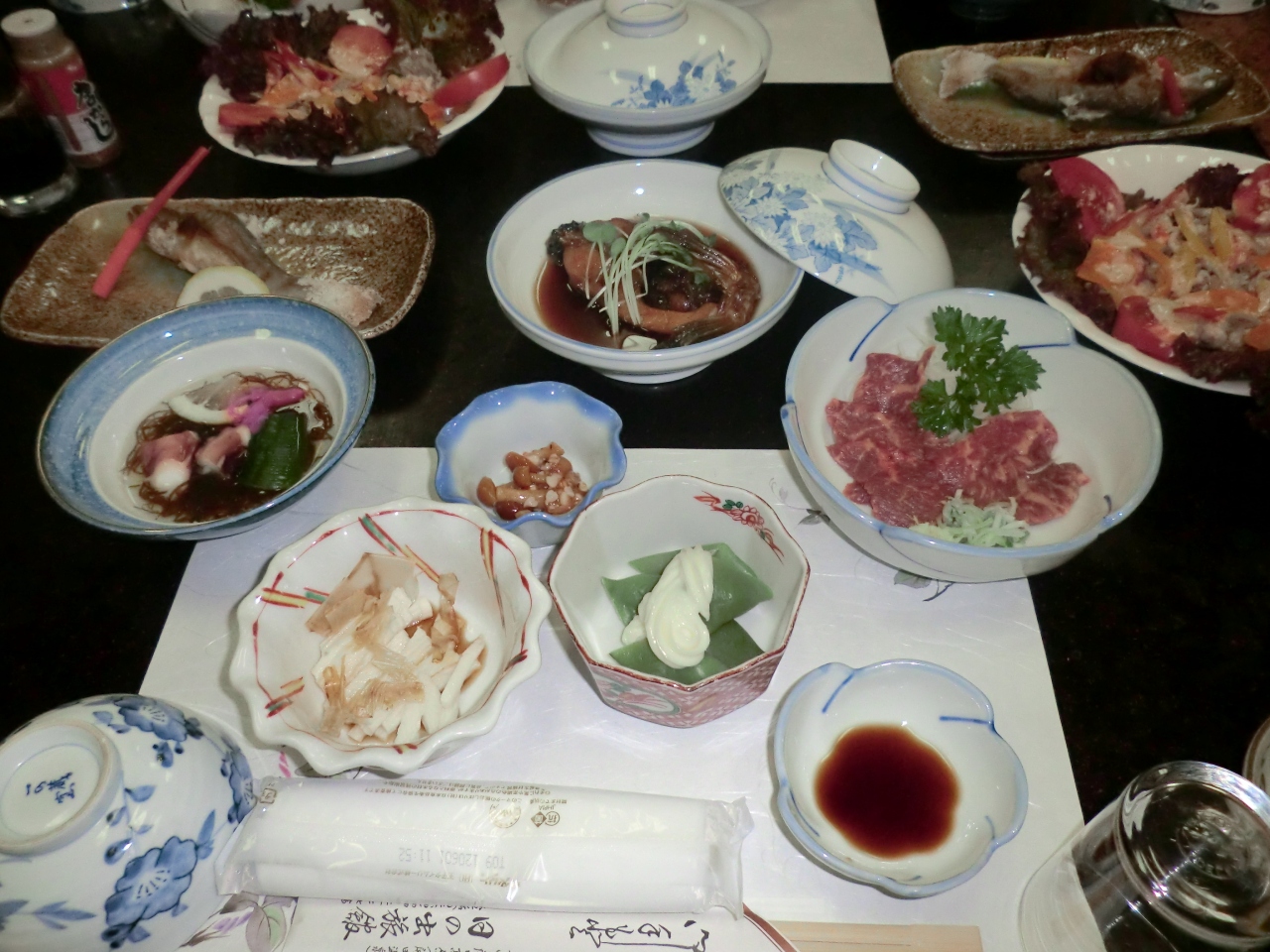 食事はこの地方の郷土料理が堪能できます。モロッコ豆、あまごの塩焼き、馬刺し、信州蕎麦、鯉の甘露煮などボリュームがあって食べきれません。大食いの私としては嬉しい限りでした。食べている最中から次の料理が出てくるのはいいのですが、最後の方に出てきた蕎麦は量が半端ではなく食べ残してしまったのが心残りです。