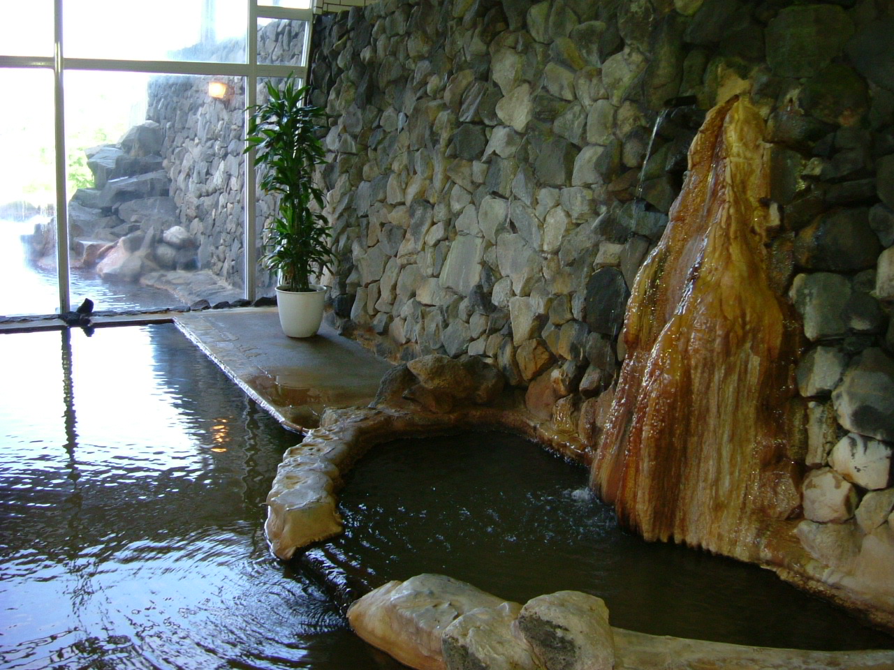 男鹿温泉郷には、日帰り入浴の客向けに「三湯めぐり」パスポート券(1000円で、三か所に入れる)があります。なまはげの地だけに、そのパスポートは、なんと包丁の形。木製のかわいい包丁で、お土産には最適かも。で、その包丁を買って、訪ねたのが、まずはこの男鹿ホテル。温泉街の中心にありまして、室内風呂と原っぱに面して、本当は星空が自慢という露天風呂に入りました。茶色の温泉の成分が岩場に厚くたまっていまして、伝統のある温泉であることがうかがえます。湯量も豊富です。