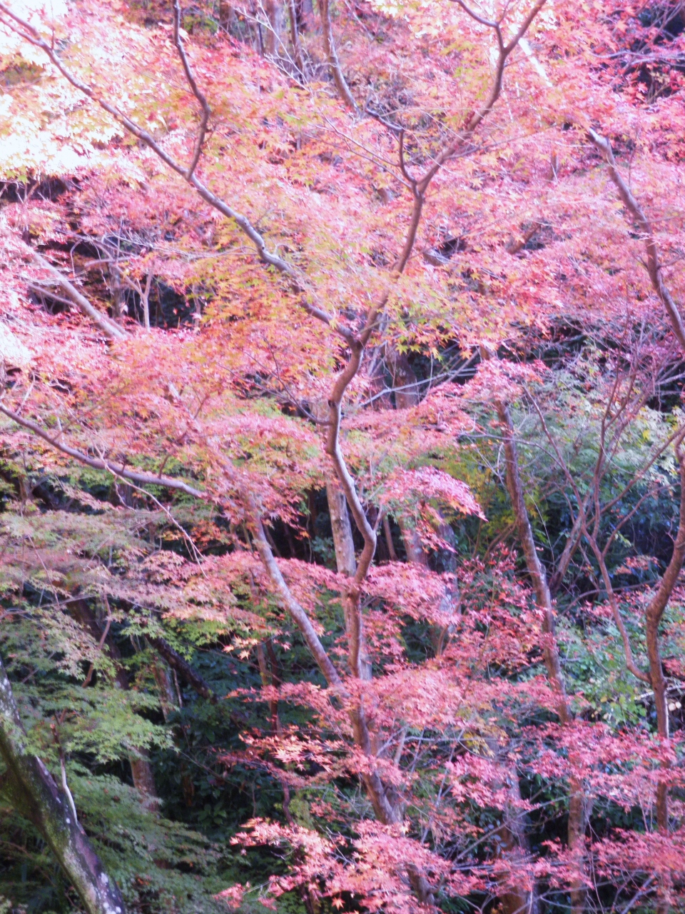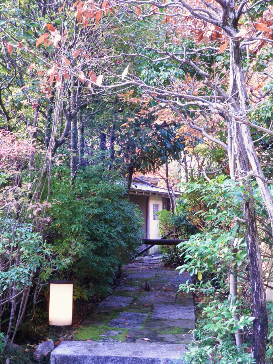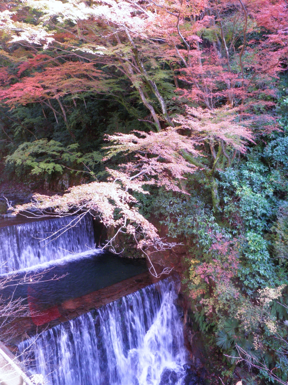 大きな大きな窓の外に真っ赤に色づいたもみじ、その下には清流と滝、部屋にいながらにして紅葉狩りができました。