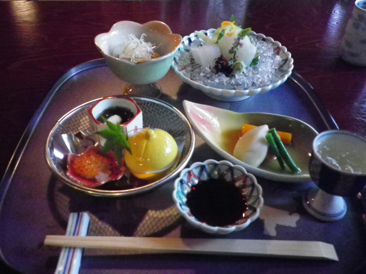 湯布院ICから10分ほどです。山灯館の四季亭で昼食を食べました。椅子席の館内は静かに食事が楽しめます。由布の膳とミニ会席を注文し絵付のお品書きを見ながら一品ずつゆっくりと味わえ、料金以上に満足しました。