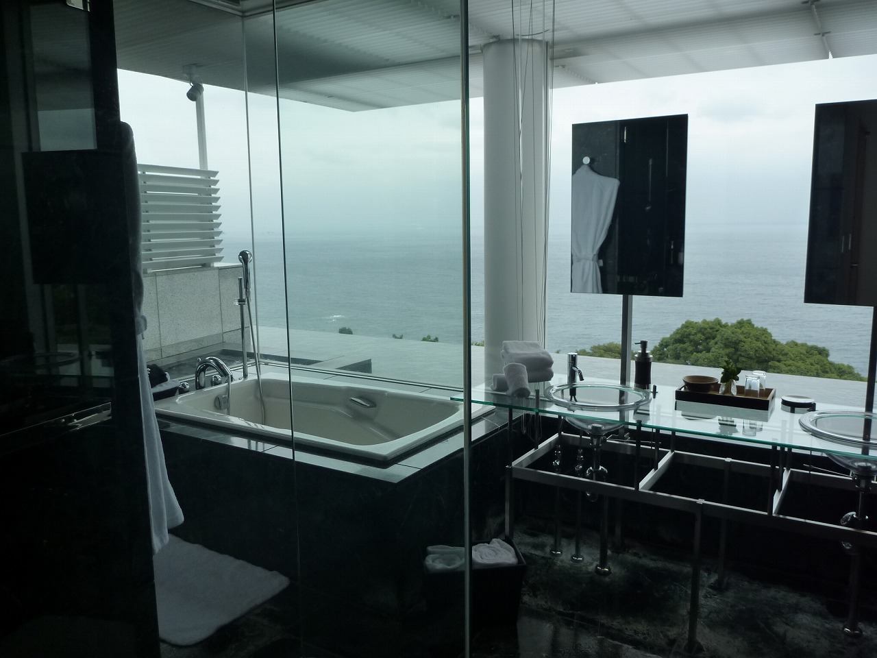 壁一面の大きな窓が特徴で、部屋を囲む池と雄大な海の景観が非日常空間を演出します。