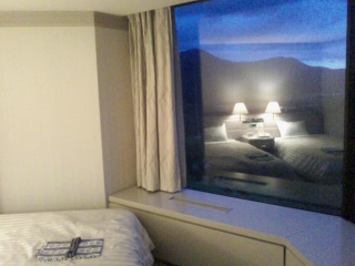 部屋はスイートではありませんが、部屋の形がちょっと特徴的で、中ほどに「くびれ」があって、ベッドのある部分とソファーやテレビのある部分とに分かれているのです。