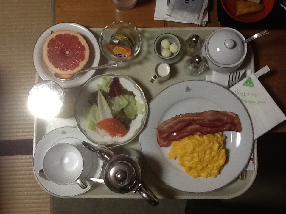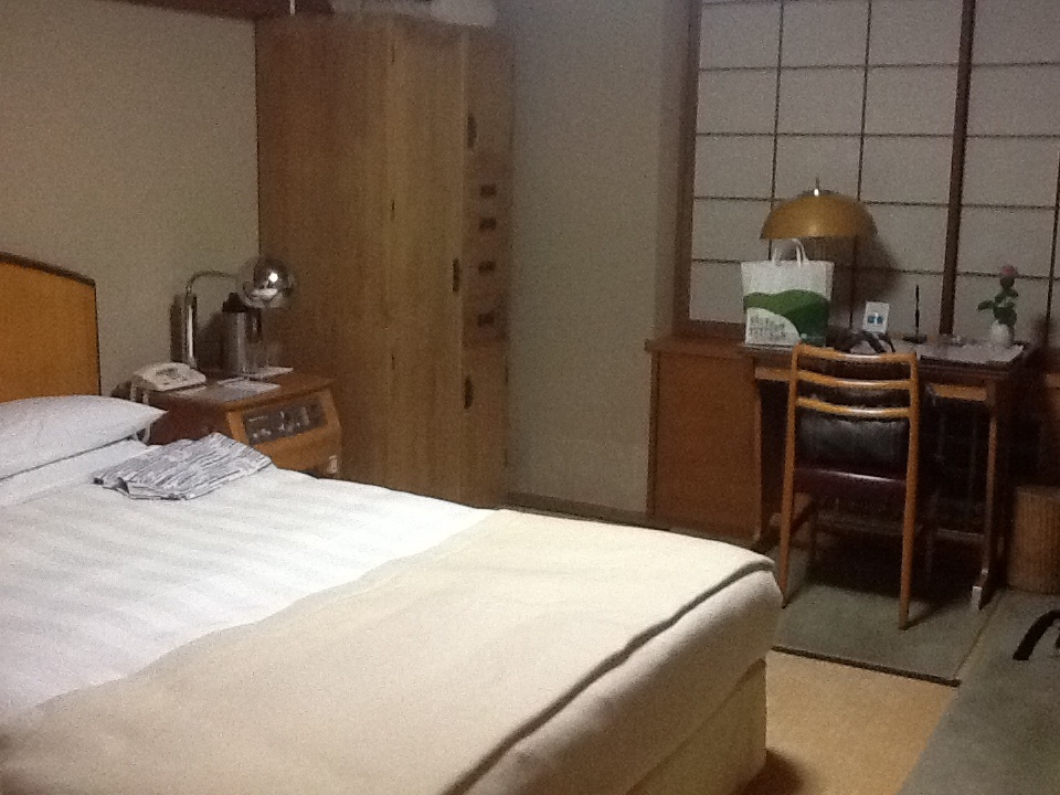数々の著名な作家たちが定宿にしてきた(いる)老舗ホテル。本館と別館あるが今回は本館に泊まった。部屋は和室にベッドがおいてあるという珍しいスタイル。これがまた、旧き良き時代と言った雰囲気で良い。チェックインするとすぐにお茶とお菓子を持ってきてくれる。朝食は和食、洋食が選べる。部屋で食べれば一人が洋食、一人が和食という頼み方も可能。