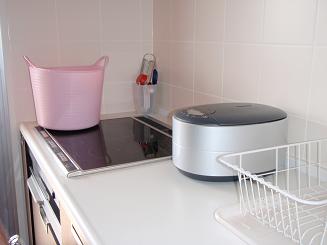 キッチンには、電気調理台、炊飯器、コーヒーメーカー、