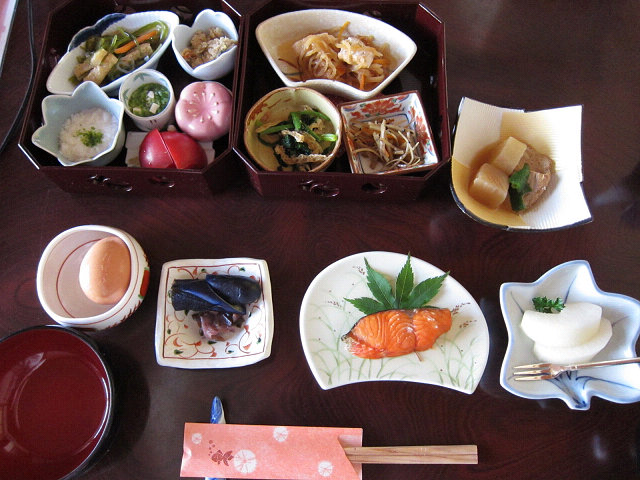 食事は、見た目にもきれいな、気の利いたもので、楽しくいただきました。お風呂は、宿のお風呂もよいですが、宿の隣の外湯(宿の方に案内していただいて鍵を開けてもらう必要があります)も、「村の共同湯」の雰囲気で、気持ちよいです。