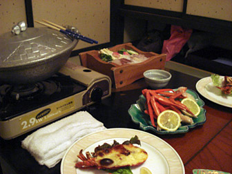 舟盛り、金目鯛姿煮、伊勢エビ、アワビ、カニ盛、海鮮しゃぶしゃぶと見た目、非常に豪勢。