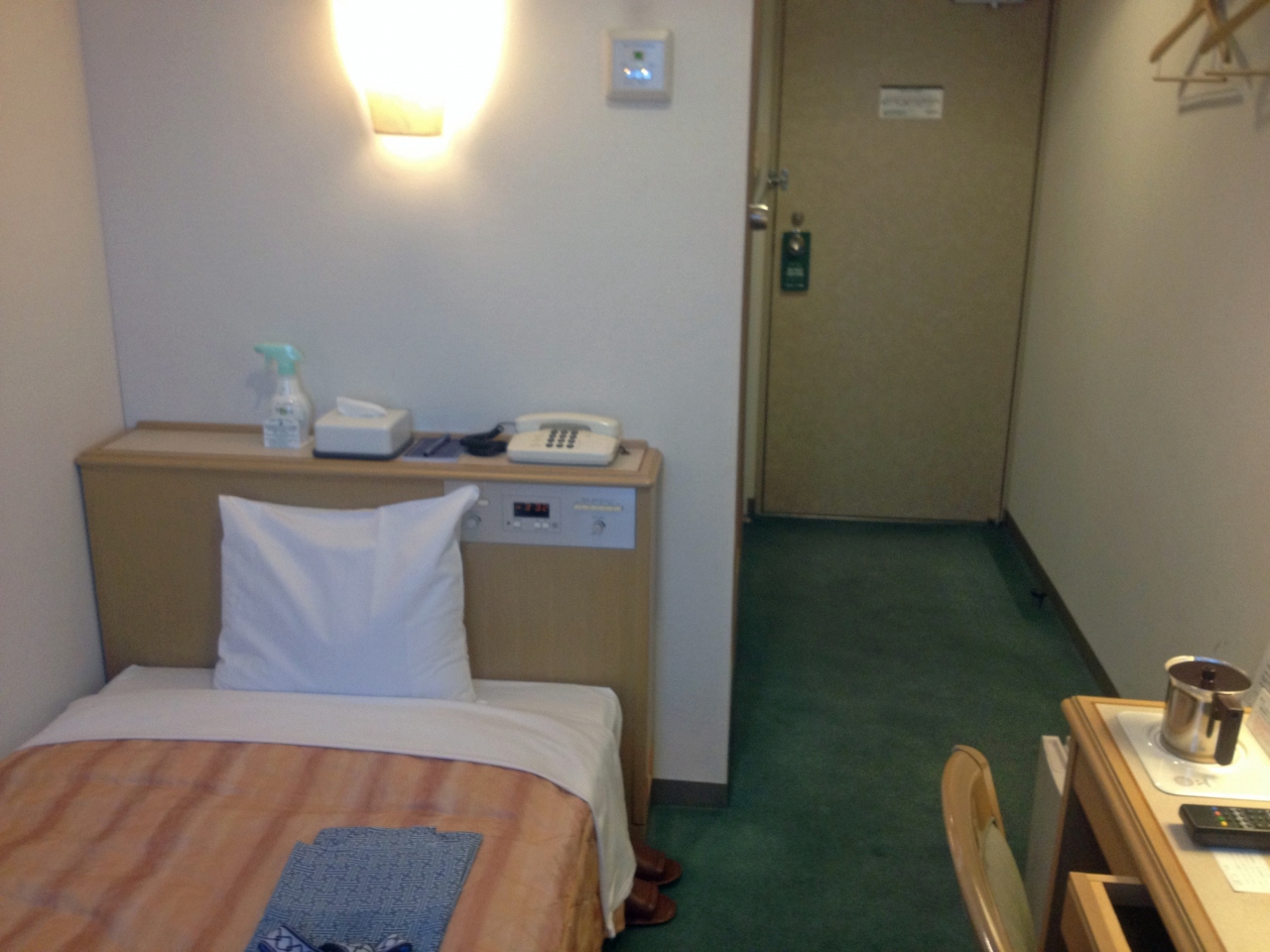 シングルルームはとてもコンパクト、テレビが置かれた机でパソコンを広げると、飲食するスペースはなくなってしまう。