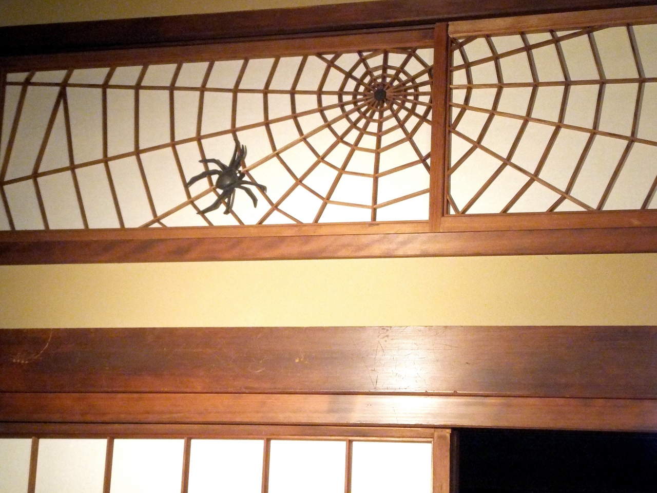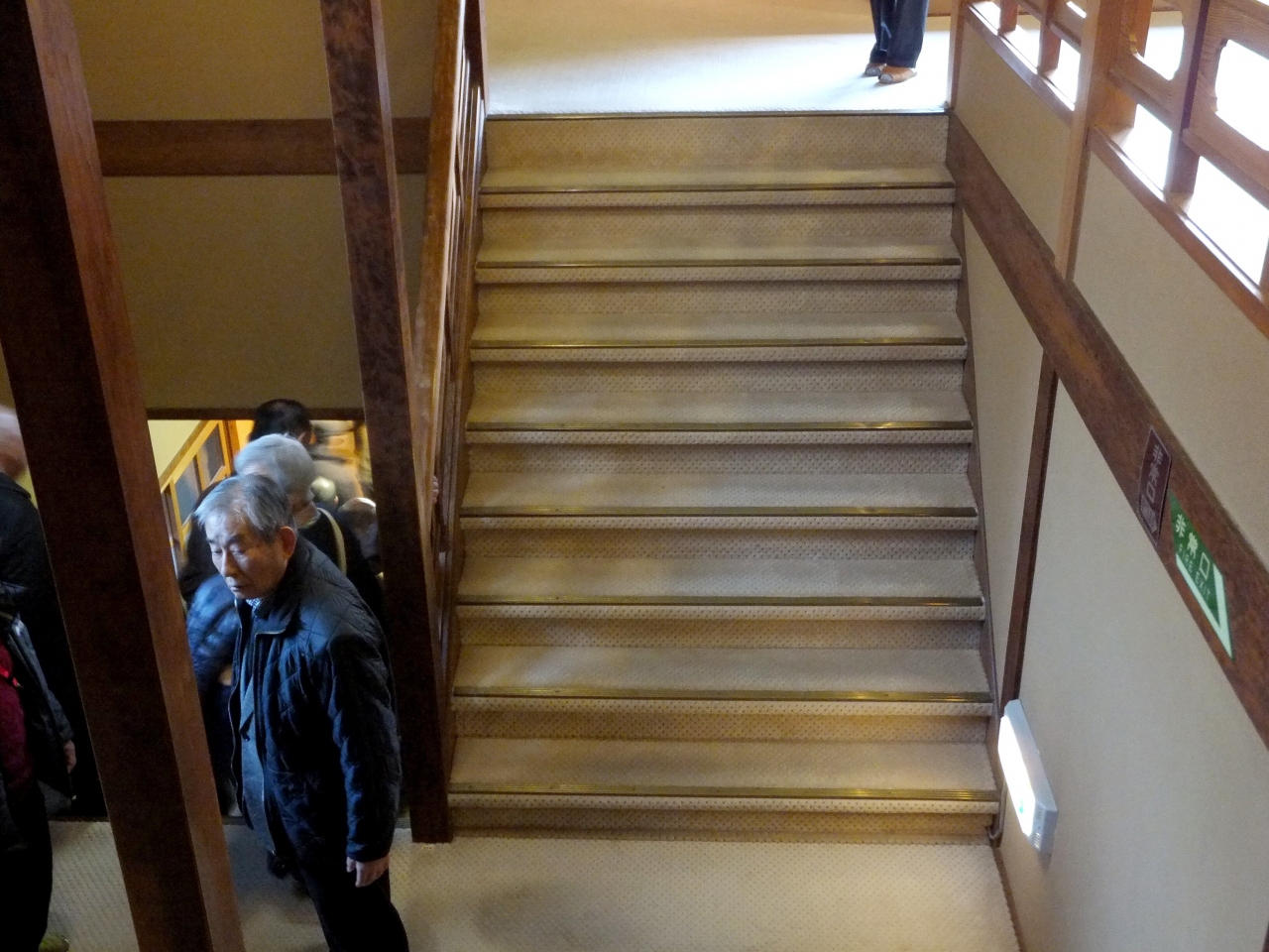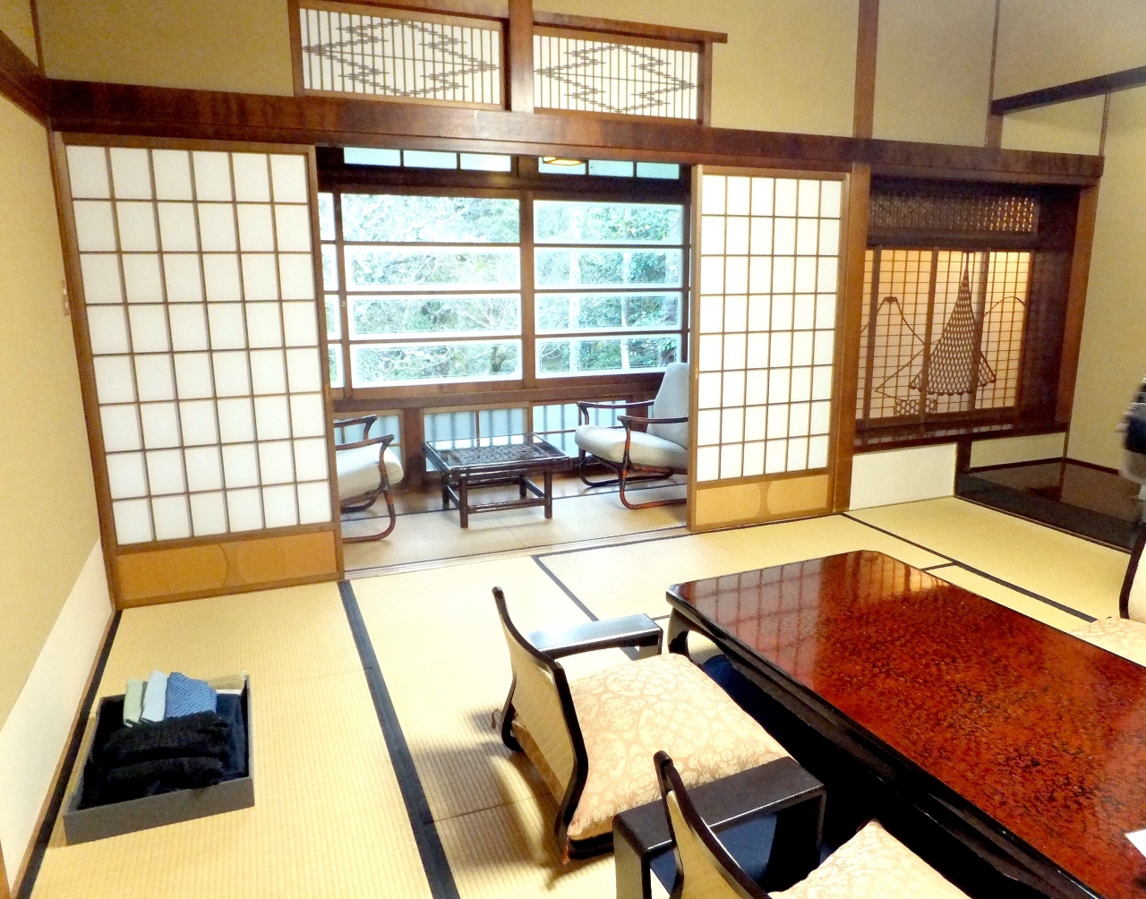 ご主人の案内で館内見物、まず玄関・大広間(紫檀の間床柱に紫檀を使用)階段・洋館・和室と欄間の竹を使つた模様(蜘蛛をあしらつた)和室の屏風(竹を使つた富士山と釣り)