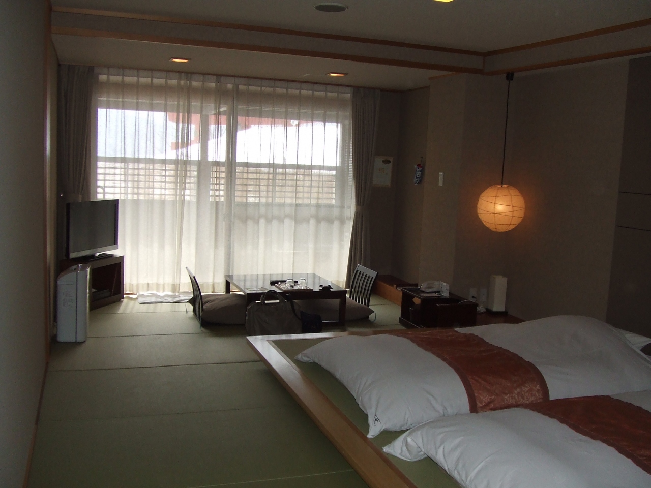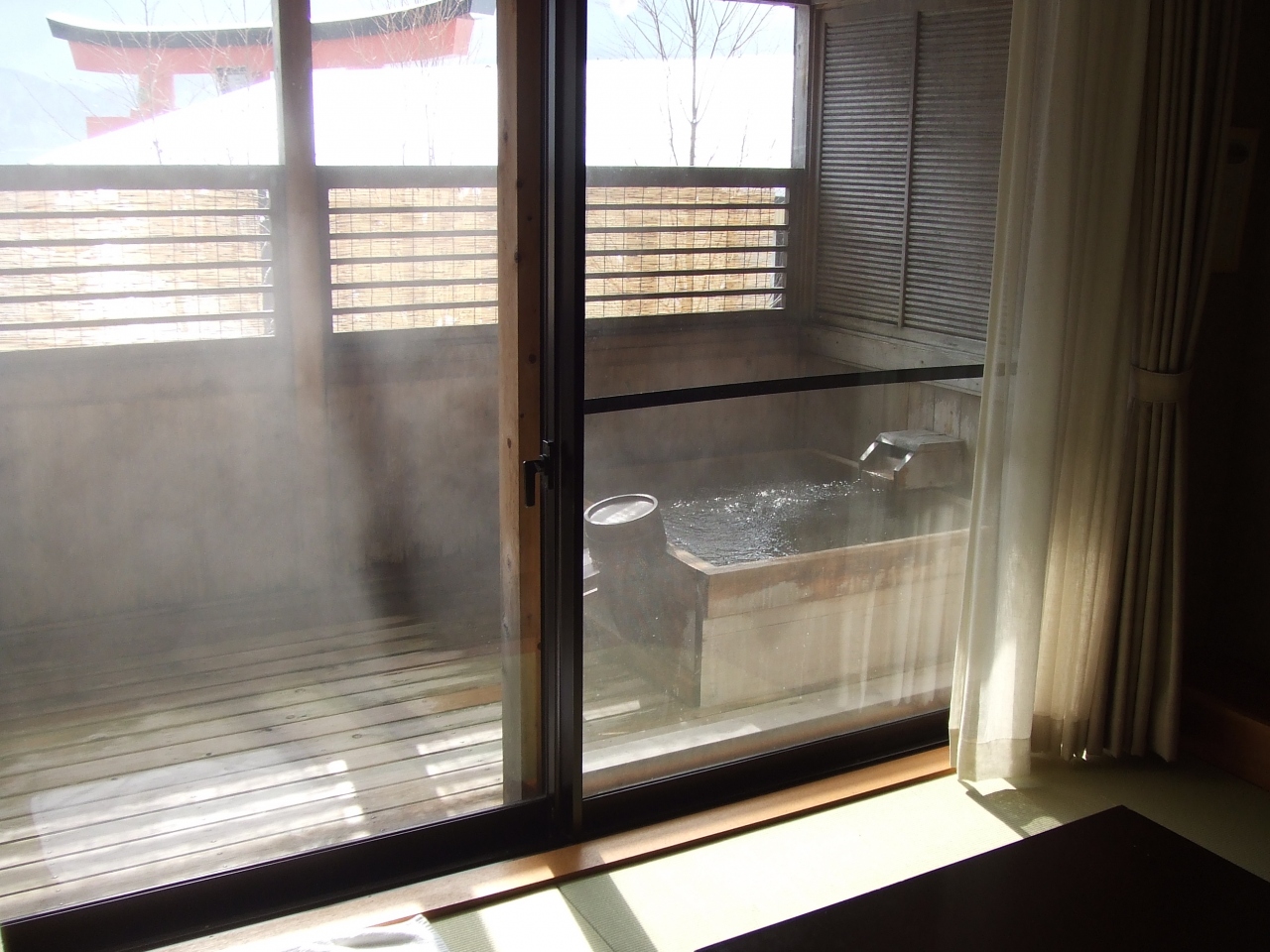 テラスに露天風呂がありますが、脱衣所とかなく部屋の窓を開けて入るようになっています。部屋からの眺望は、座っていると中禅寺湖を見ることが出来ません(テラスの壁に遮られます)。