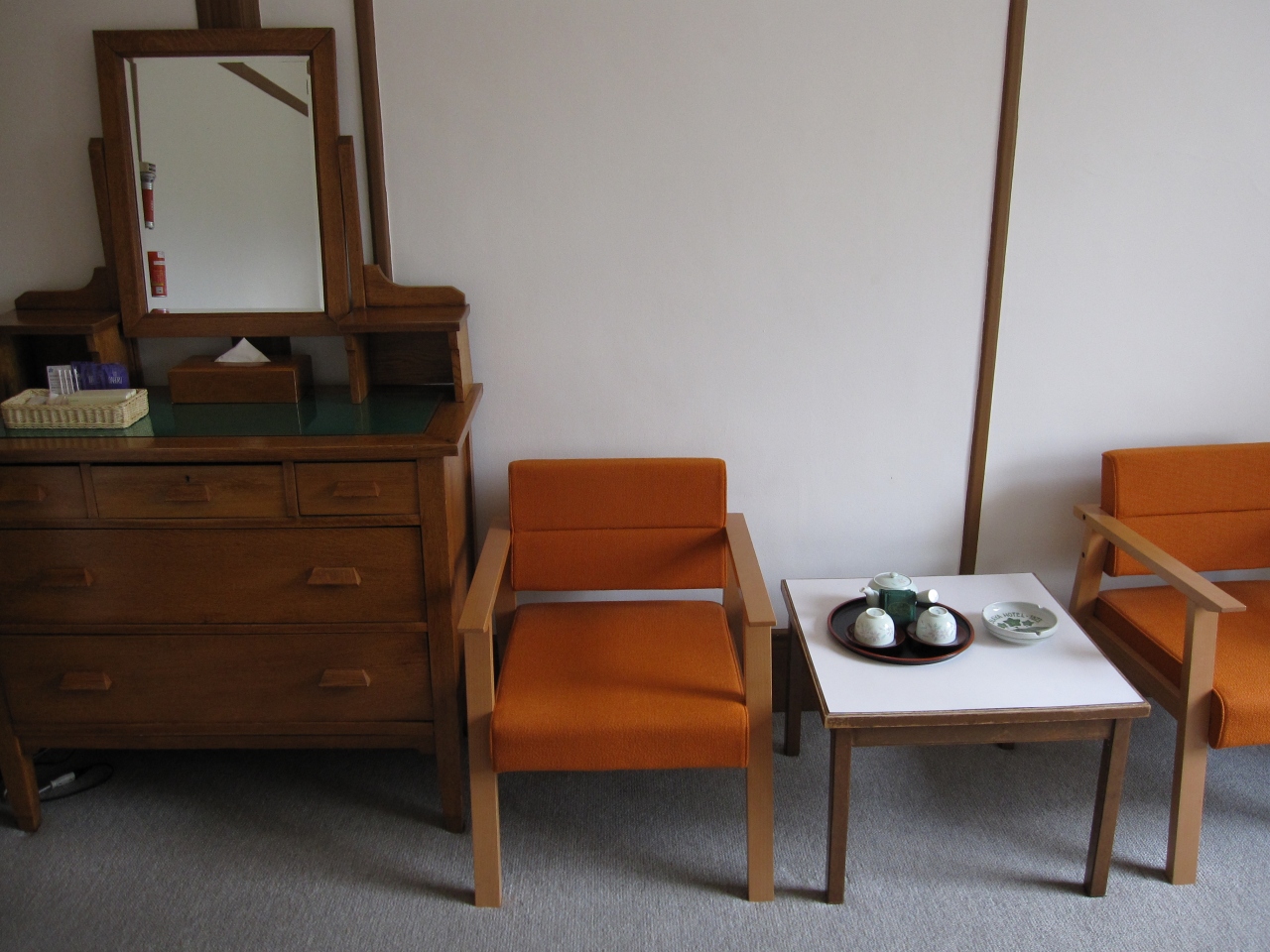 部屋は白い壁に木のぬくもりを活かしたつくり。時の流れを感じさせながらも、古臭さはなく、心地よい空間でした。花(?)のモチーフが彫られた木製の部屋のキーホルダーも印象的。