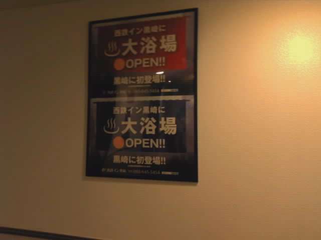 黒崎駅近くの西鉄インで、ビジネスホテルなのに大浴場が付いています。小倉、黒崎と飲んで帰って、ホテルで一風呂、本当に一息つけます。部屋とかはそんなに豪華ではありませんが、西鉄インはどこに泊まっても、サービスもしっかりしていて安心できます。