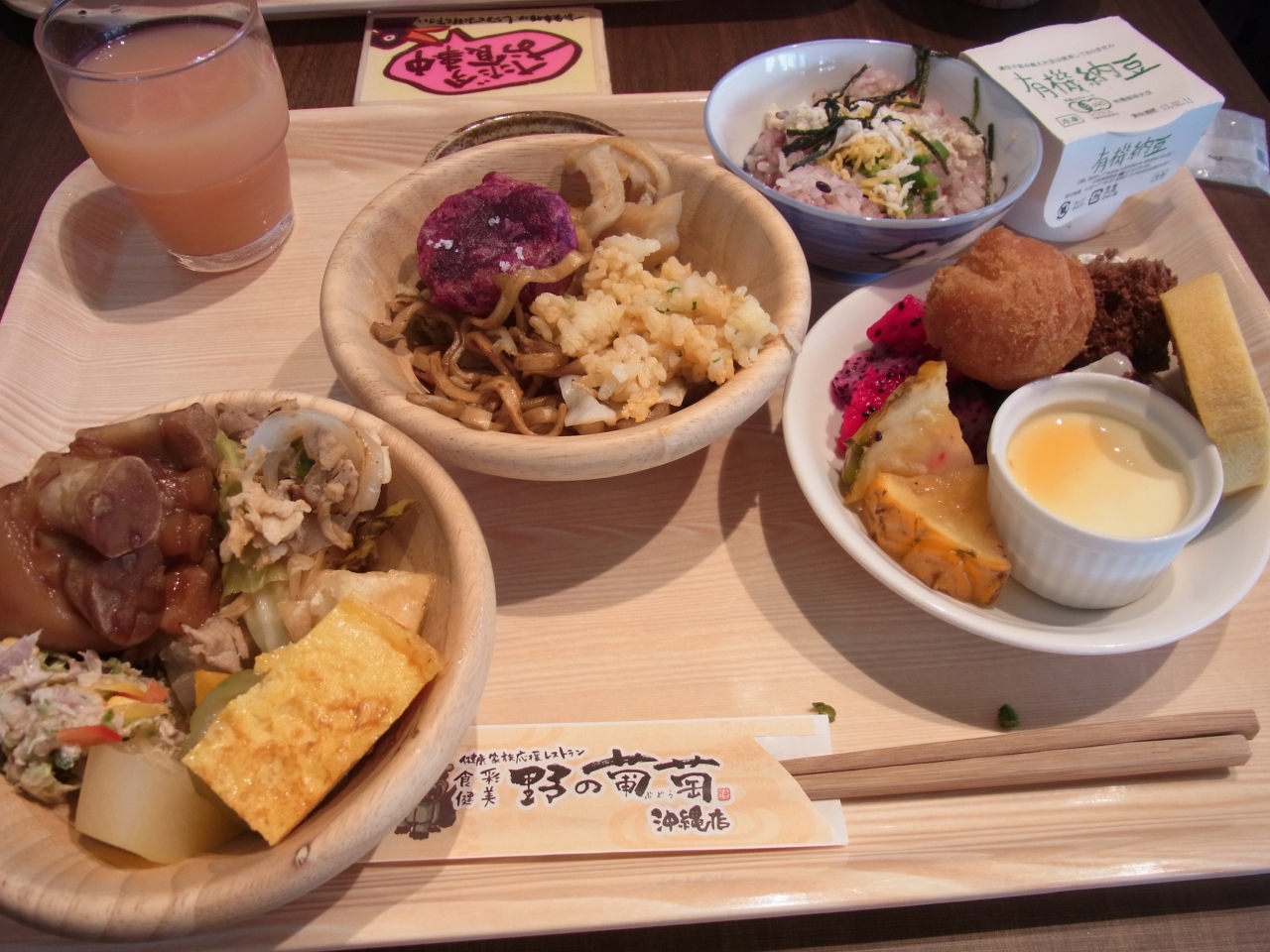 朝は併設の居酒屋でバイキングでしたが、沖縄の料理がいくつもおいてあり、
