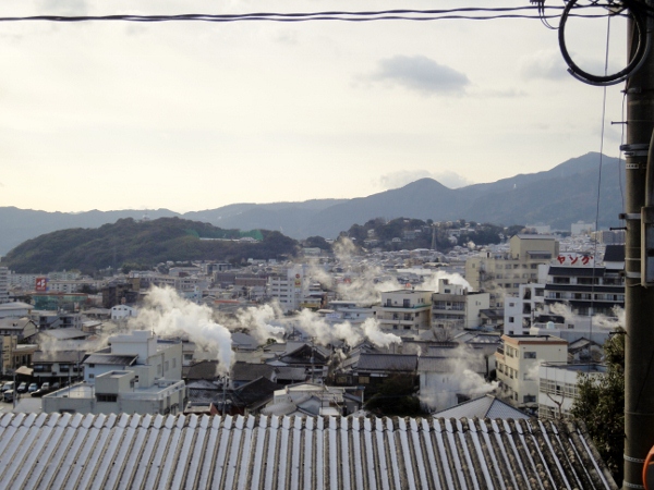 ベランダから見える鉄輪温泉の湯けむりは絶景です。