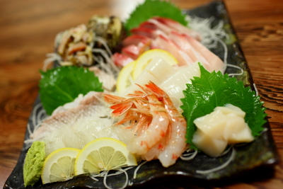 お刺身盛り合わせ、ばいがい、はたはたの素揚げ、あかがれいの煮付け、