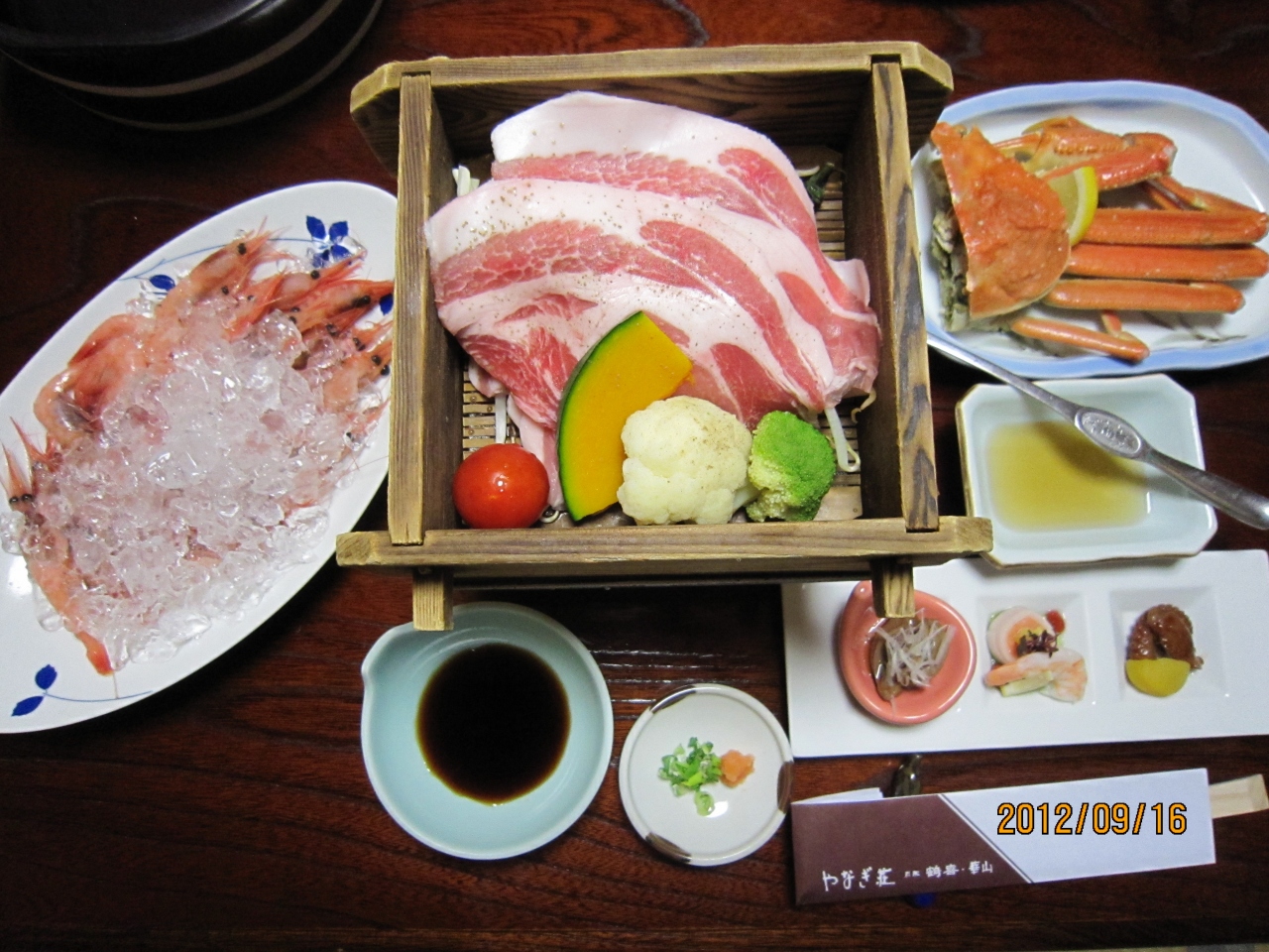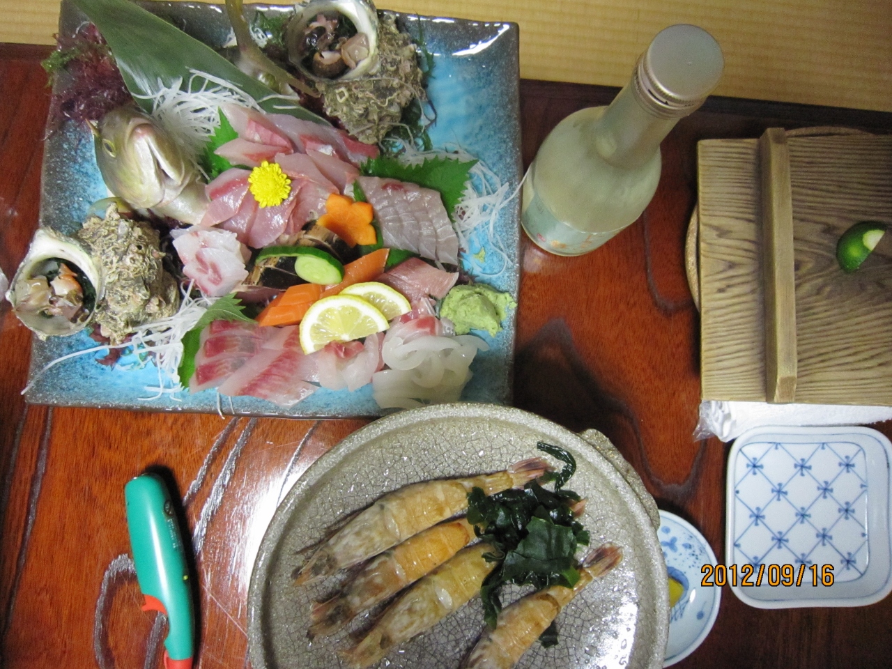 夕食は、あえて「名物のかまくら」ではなく、「舟盛+甘エビ20尾」のプランにして、一泊二食付、一人15,750円(税込、入湯税別、外湯めぐり入浴券付)でした。評判通り、お料理は品数も多くボリュームもあり、最初のうちは、美味しく食べていたのですが、余りにもボリュームがあり過ぎて、正直なところ、甘エビやお造りは途中で飽きてしまう程で、結局、お腹がはちきれそうになるまで食べましたが、残念ながら、完食は出来ませんでした。