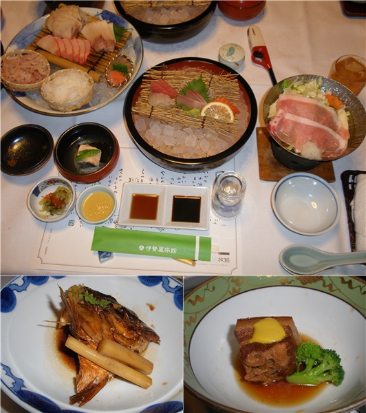 食事ですが夕食はさぞかし立派なもので、クジラのお刺身だけでも5品ありそれ以外にも魚の刺身や煮付け、豚の角煮や鍋物や天ぷらなどほとんどが和食の中に洋食メニュー(チーズ焼き)も少し含まれておりました。