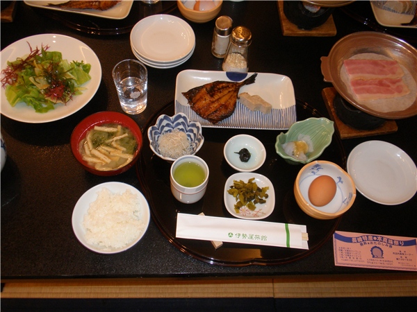 朝食はあっさりと和定食でしたが、鉄板にベーコンがのっていて卵と一緒に焼いてくださいといわれたものの、他に岩のりや漬物があるので卵はたまごかけごはんで利用しました。