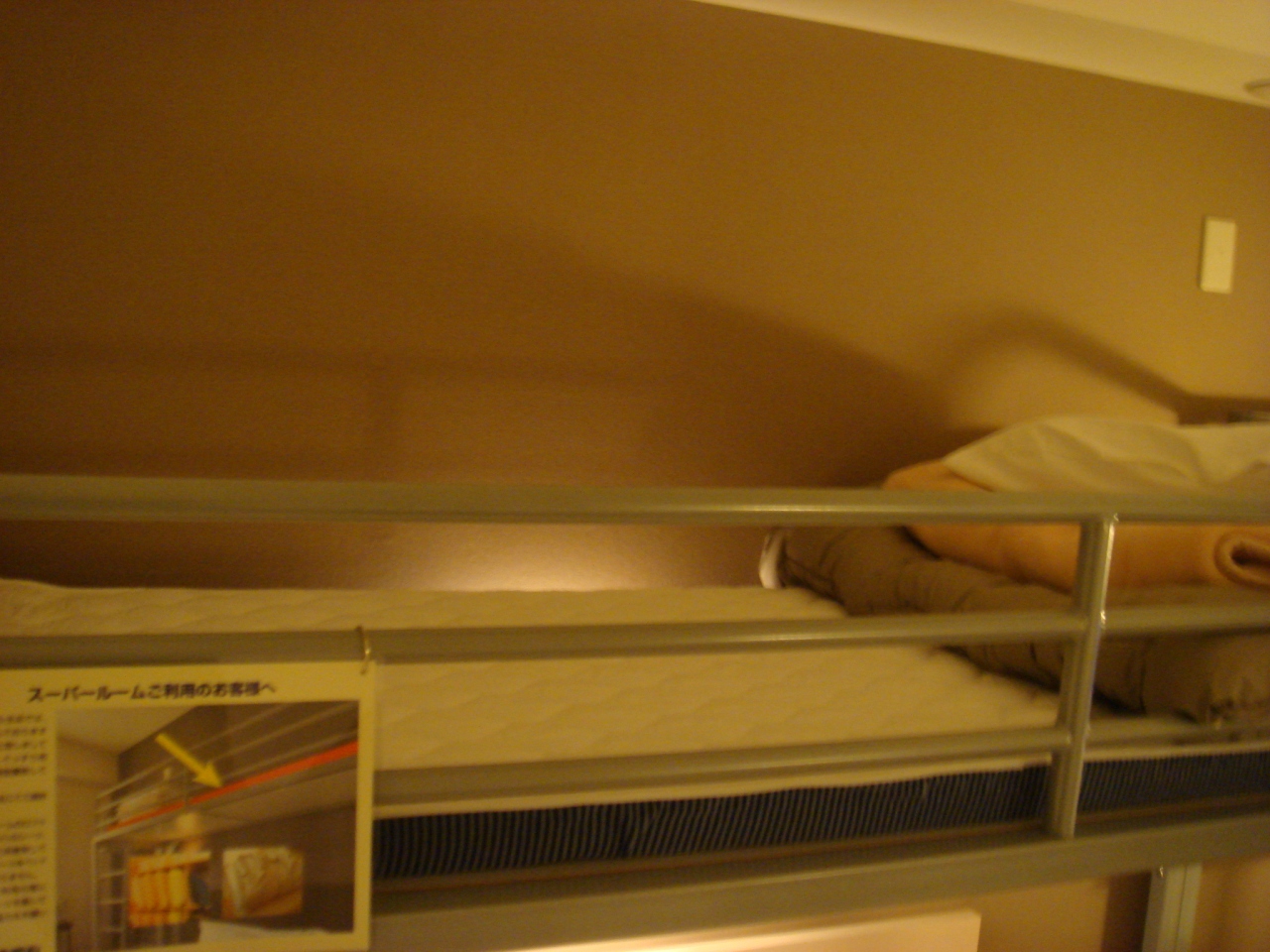 施設はまだ新しいようで、部屋は狭いが非常にきれい。スーパールームというロフトベッド付の部屋、圧迫感があるが荷物置きに。