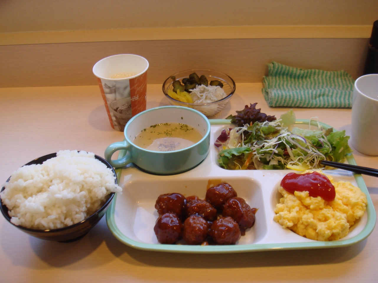 朝食はご飯とおかず2種、サラダとスープ。無料なので言いたくないがおいしくはない。