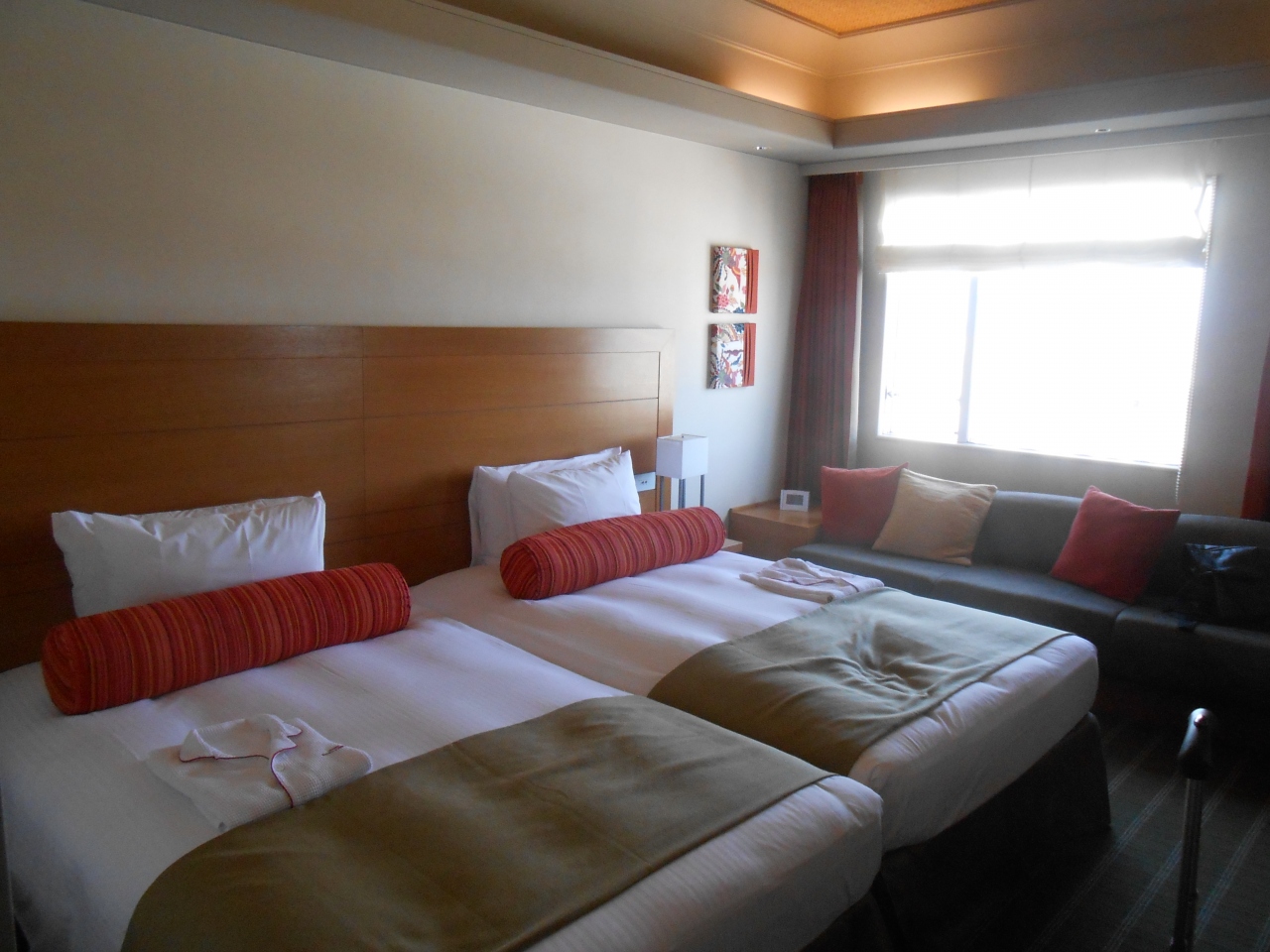 ホテルは那覇市内中心部にあるホテルと比べて大きくゆったりとしていた。客室もツインだと十分な広さがあり、13階の客室に泊まったため眺望も抜群。那覇市内やモノレール、向きによれば海も見ることができた。アクセスはレンタカーなら問題ないが、モノレールは不便でバスの方が使い勝手は良さそう。朝食もおいしく、沖縄料理もある和洋バイキングで大変満足でした。