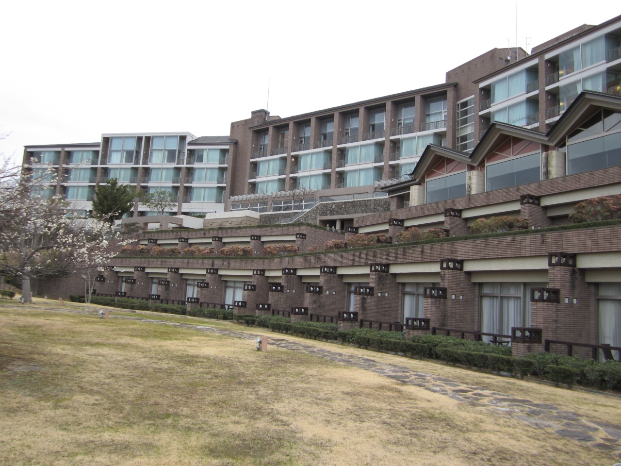 中庭の散歩中、梅の花もキレイでしたが、中庭から見るホテルもリゾート感たっぷり。