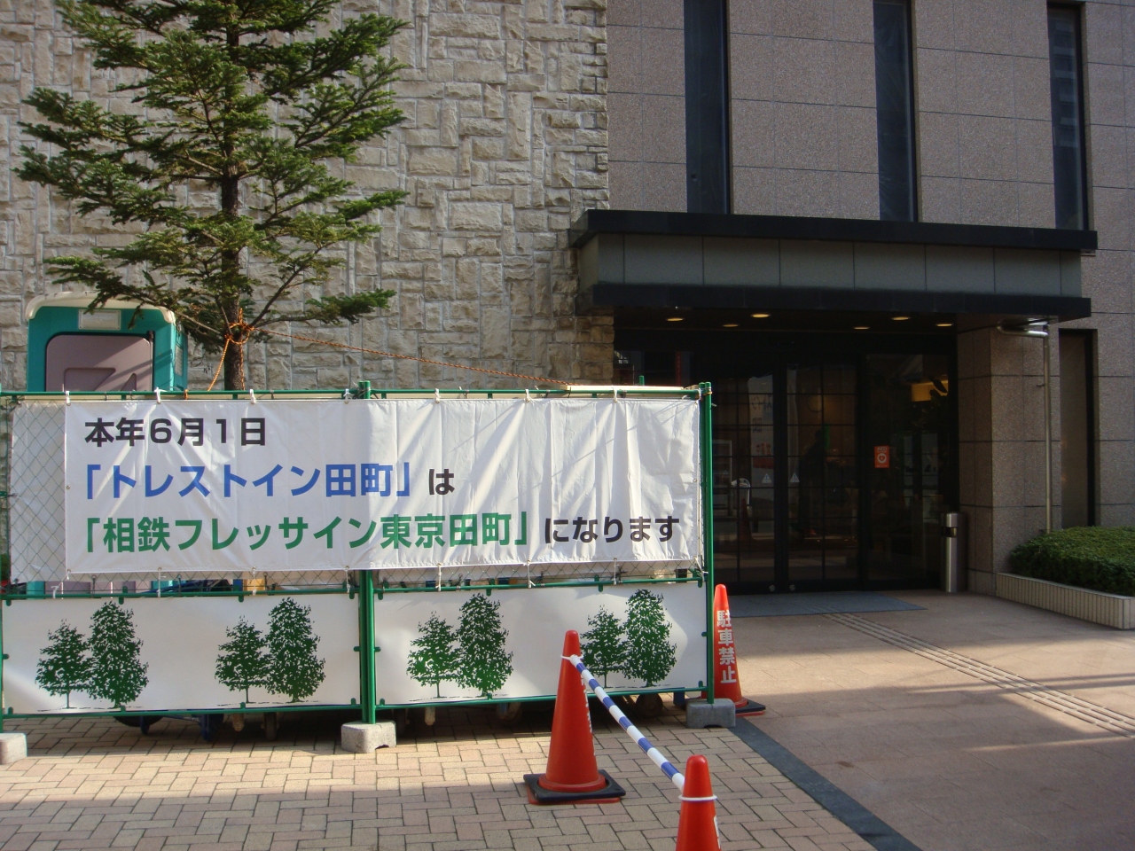 田町駅芝浦口から歩いて5分程度にあるごく一般的なビジネスホテル。仕事の関係で一度泊まりましたが、料金も一泊6000円程度で都内では安い部類に入るでしょう。現在は改装中ということで、玄関前に「6月1日トレストイン田町は相鉄フレッサイン東京田町になります」の案内。