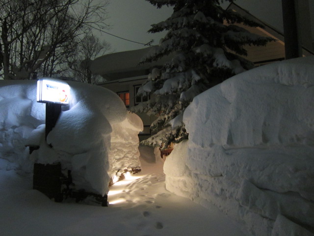 6、ペンション入口が雪の壁で覆われているが、ライトアップがなかなかいい感じ!