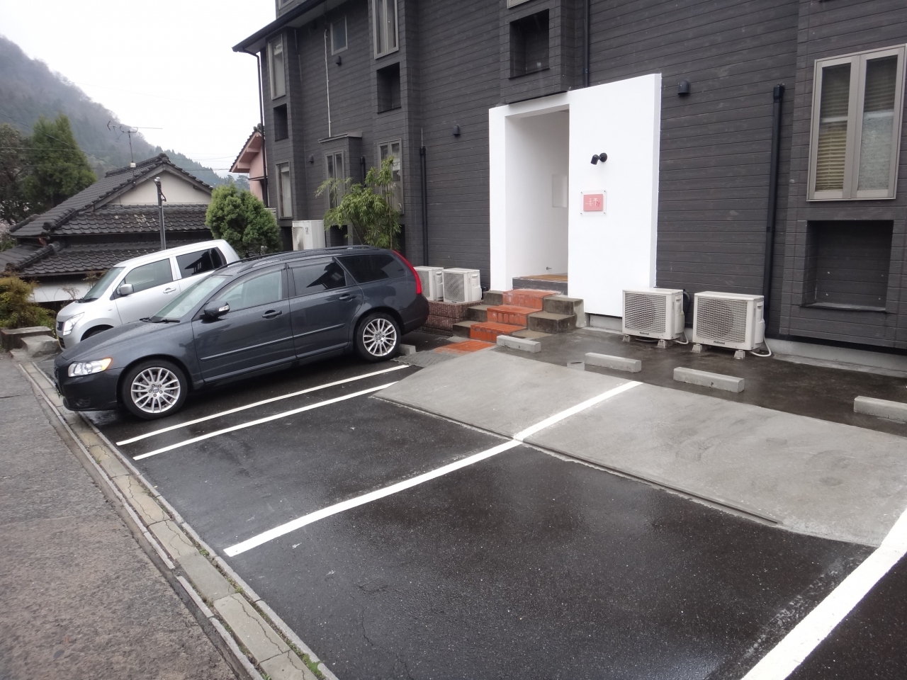 ホテル前が駐車場。少し狭いけど、焦らず停めれば問題なし!