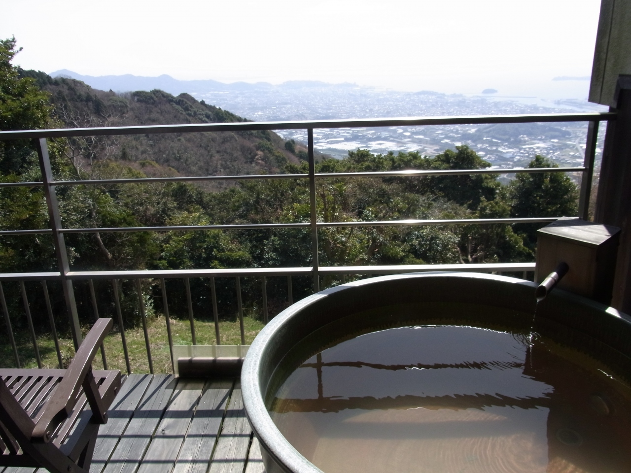 海の見える、夜景の見える、露天風呂付き個室!をよ~~~~く吟味してこちらに決めさせていただきました^^月昇宮に泊まりました。部屋は畳にマットがひかれたベッド。現代的な和室で落ち着きます。ベランダは3畳くらいの広さで、湯船と椅子が置かれています。湯沸しもできます。夜景と月がとてもきれいでした^^