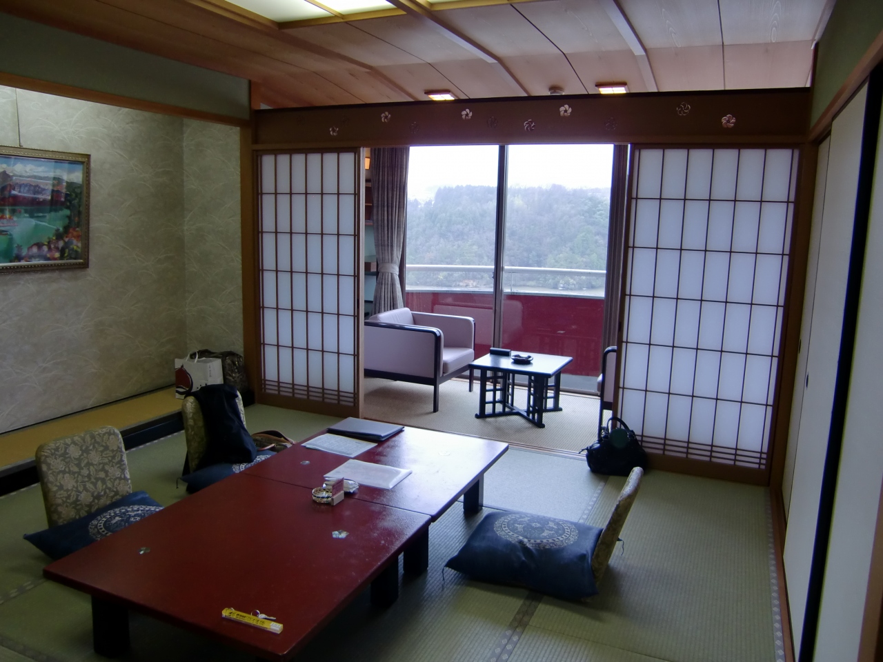 ダム湖に面して立地しており、傾斜地に建っているので玄関およびロビーが3階になっています。(私たちの客室は1階でした。)ちなみにお隣の国際ホテルはロビーが4階でした(^^;