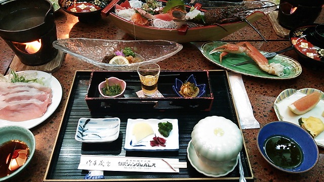 - 小さいながらも伊勢エビや刺身の舟盛りやカニがあり、女性には満足な量だった。朝の伊勢エビのみそ汁は出汁が効いていて美味しかった。