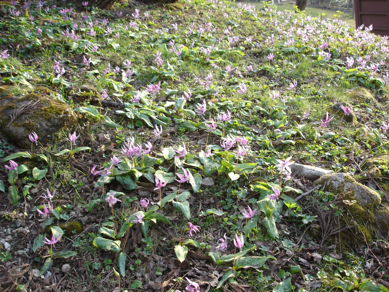 5月の連休に行ったところ、ケビン周りの緩斜面にカタクリが満開でした。山かげにはまだ残雪が。残雪の多い年は、季節の進行が遅れるようです。