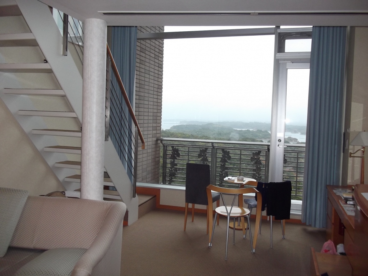 メゾネットタイプの部屋に宿泊しましたが、リビングが1階、寝室が2階という構造。吹き抜けのリビングは、大きな大きな窓によりとても開放的で明るく、英虞湾の眺めを堪能できました。