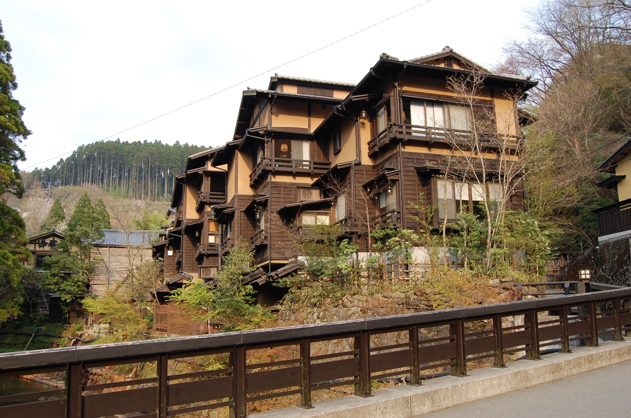 黒川温泉の中心部の川沿いに建つ老舗旅館。橋から見る建物は絵になります。