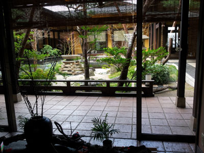 ロビーから中庭見られるオシャレな作りです。生け花が飾られていい感じ。