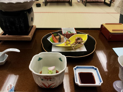 京懐石コースを頂きます。天ぷら、焼き魚、近江牛のすき焼きと言った内容ですが、季節の食材を上手に出してくれるので、美味しい。