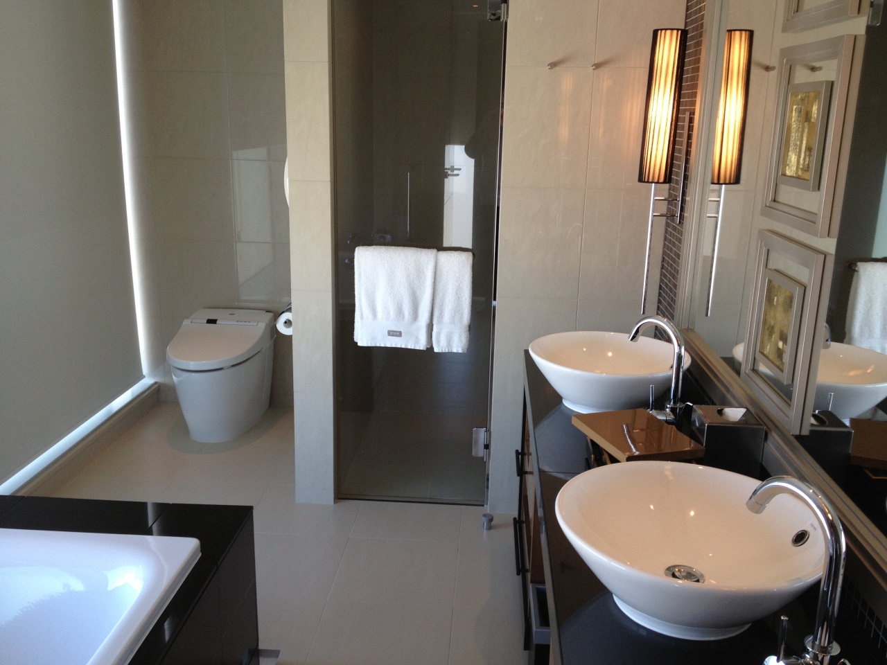 バスルームの仕切りは、曇りガラスとブラインドになっていて、曇りガラスですので、風呂に入りながら外の景色は見えず、立つと見える感じです。