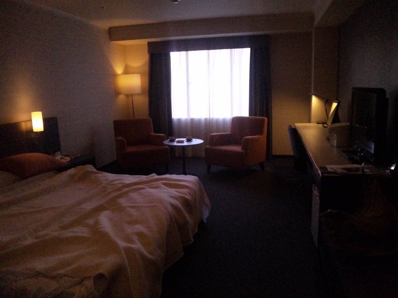 チェックインの際、禁煙ルームがあいていないか聞いたら、あいにくの満室で、少し広い部屋へグレードアップしてくれました。