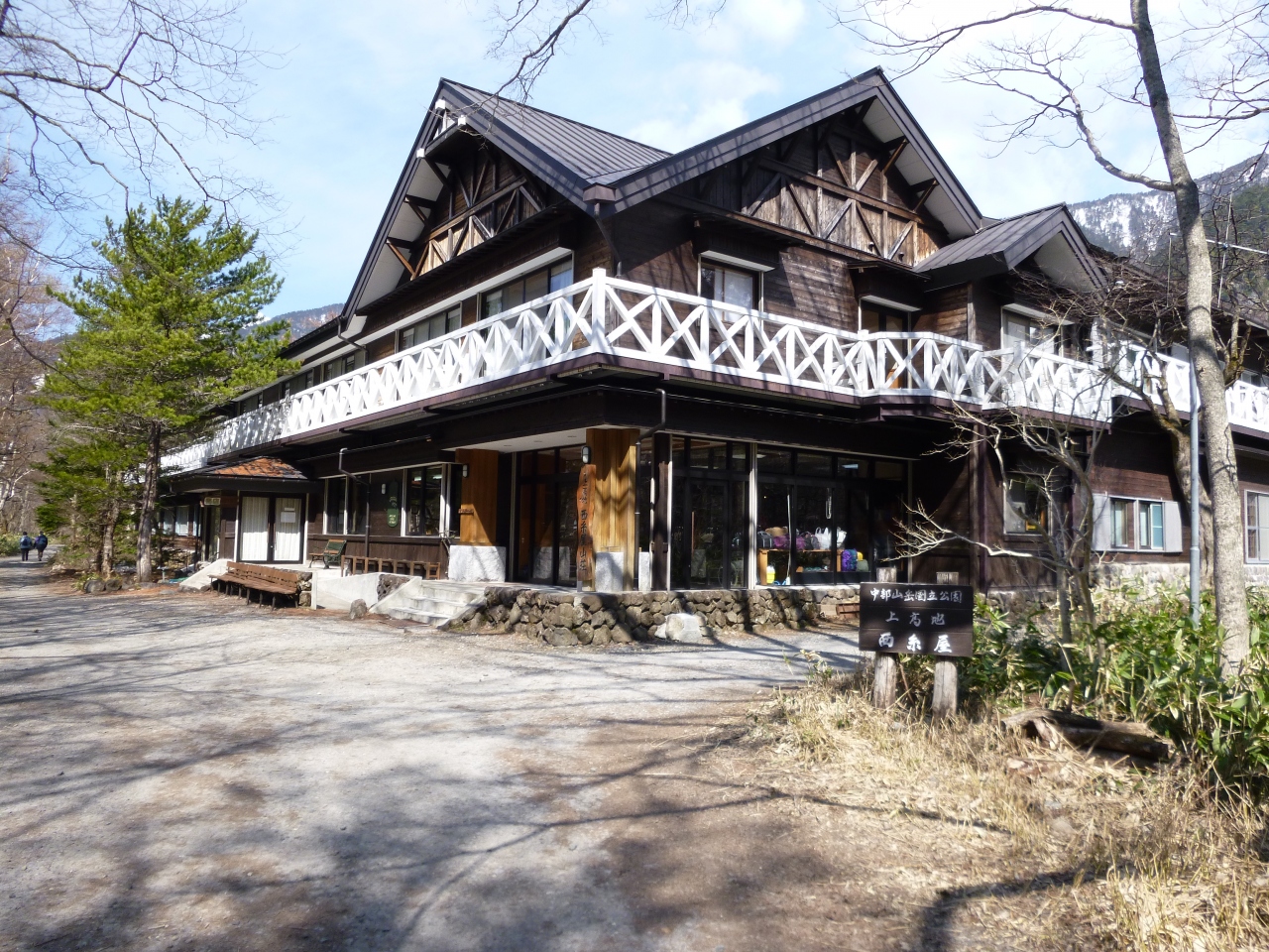 上高地バスターミナルから河童橋を渡り梓川沿いに歩いて8分のところにあります。値段は上高地の他の宿に比べリーズナブルですが、建物もきれいで食事も美味しいです。夕食は和洋折衷でテーブルから溢れるくらいの品数があり、部屋でいただけます。喫茶室では無料でコーヒーや、ティーバックのお茶を楽しむことができます。