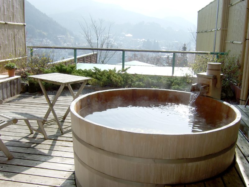 寝室のカーテンを開けるとテラスと豪華な露天風呂が。