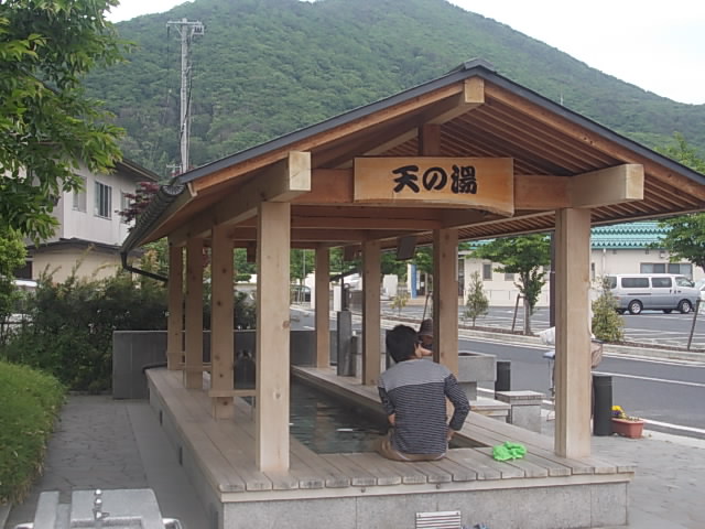 この宿は、目の前に天の湯と呼ばれる足湯があることで知られています。この天の湯は、正確には足湯だけでなく、手湯や飲用泉なども併設されていて、ここで観察をしていると、地元の方は、日常的に軽く立ち寄って飲用だけしたり、軽く手を付けるだけだったり、じっくりと足を浸けて物思いに耽っていたり、と、自由に楽しんでいる雰囲気が、ホテルの占有物でなく、住民の共有財産として大切にされている、という感じで好感が持てました。