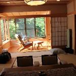 露天風呂付の離れに宿泊しました。敷地は広大で、離れは母屋と縁側で結ばれたちょっと離れたところにあります。もともとこの旅館は、草津の湯畑のある中心街からは、かなり離れているので静かです、庭園がきれいで緑が美しいですね。風呂は「遊山の湯」「万代の湯」「西の湯」があり、それぞれ露天風呂と内風呂が備えてあるため、全部で露天風呂は3つ、大浴場は3つあります。そして、お風呂によって源泉が異なり、2種類の源泉が引かれていましたす。どのお風呂も小さいですが、庭がながめられゆったりとくつろげます。また、この旅館にはカラオケや娯楽場が一切なく静かで団体客もいないのでいいですね。