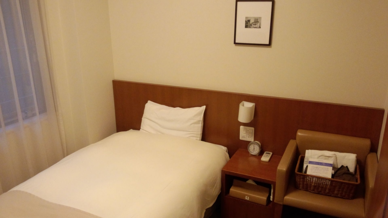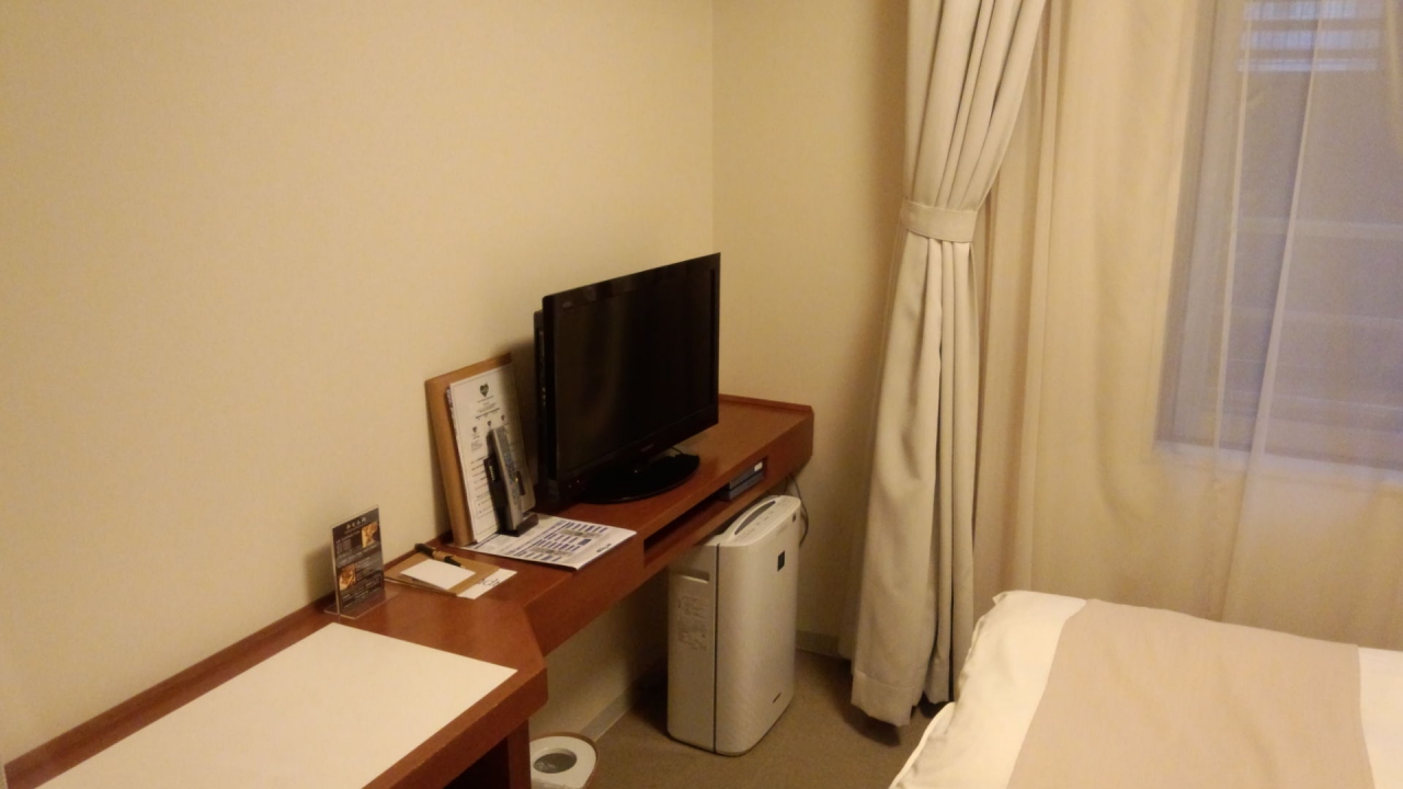 部屋はあちこちにあるドーミーインと同じ造り。部屋のデスクが狭く(幅は広いが奥行き30cm程度)、イスもリラックスできるようなものではありませんから、ビジネス利用には文句なしですが、旅行などでゆっくりするという方には今イチです。