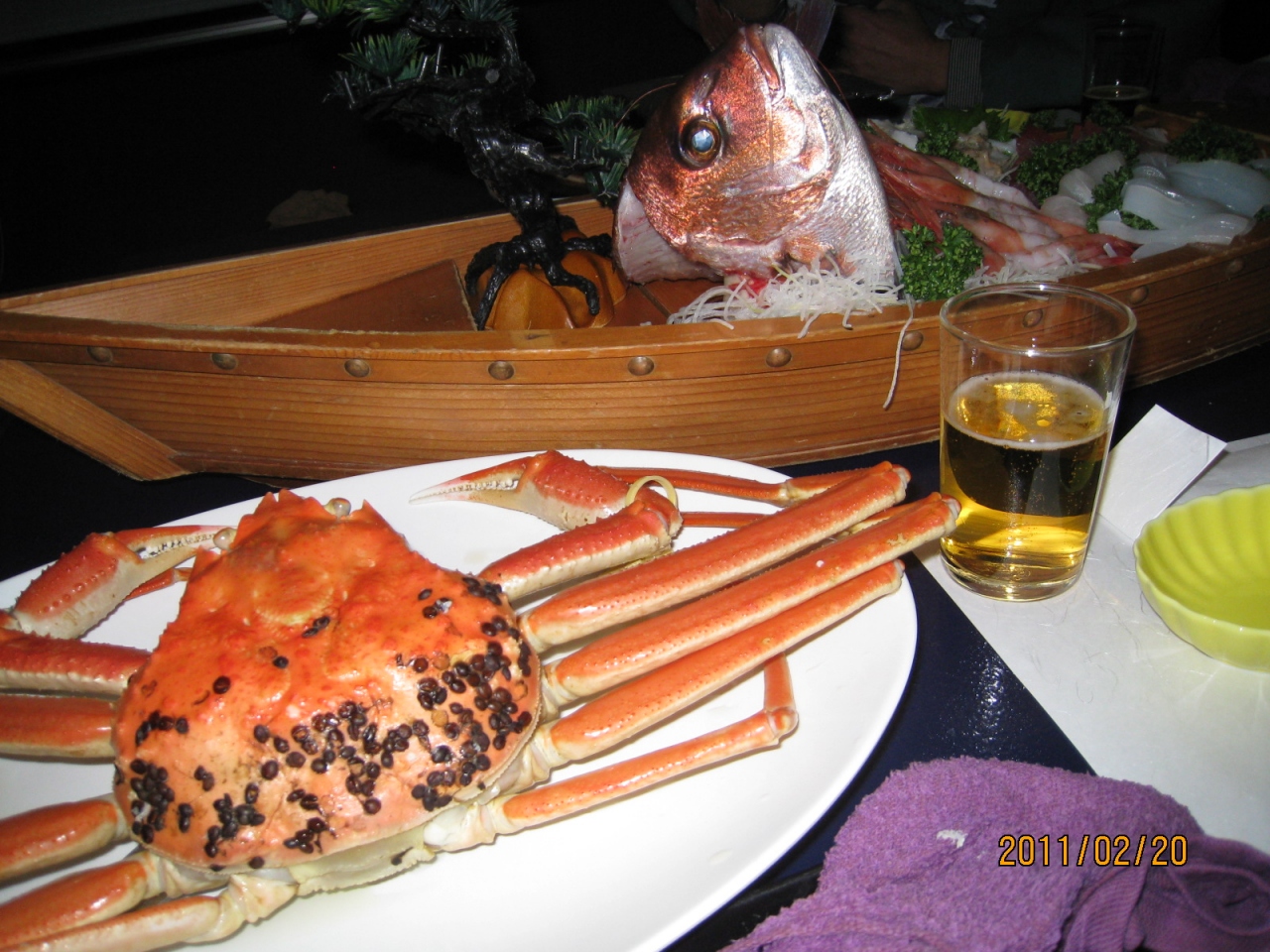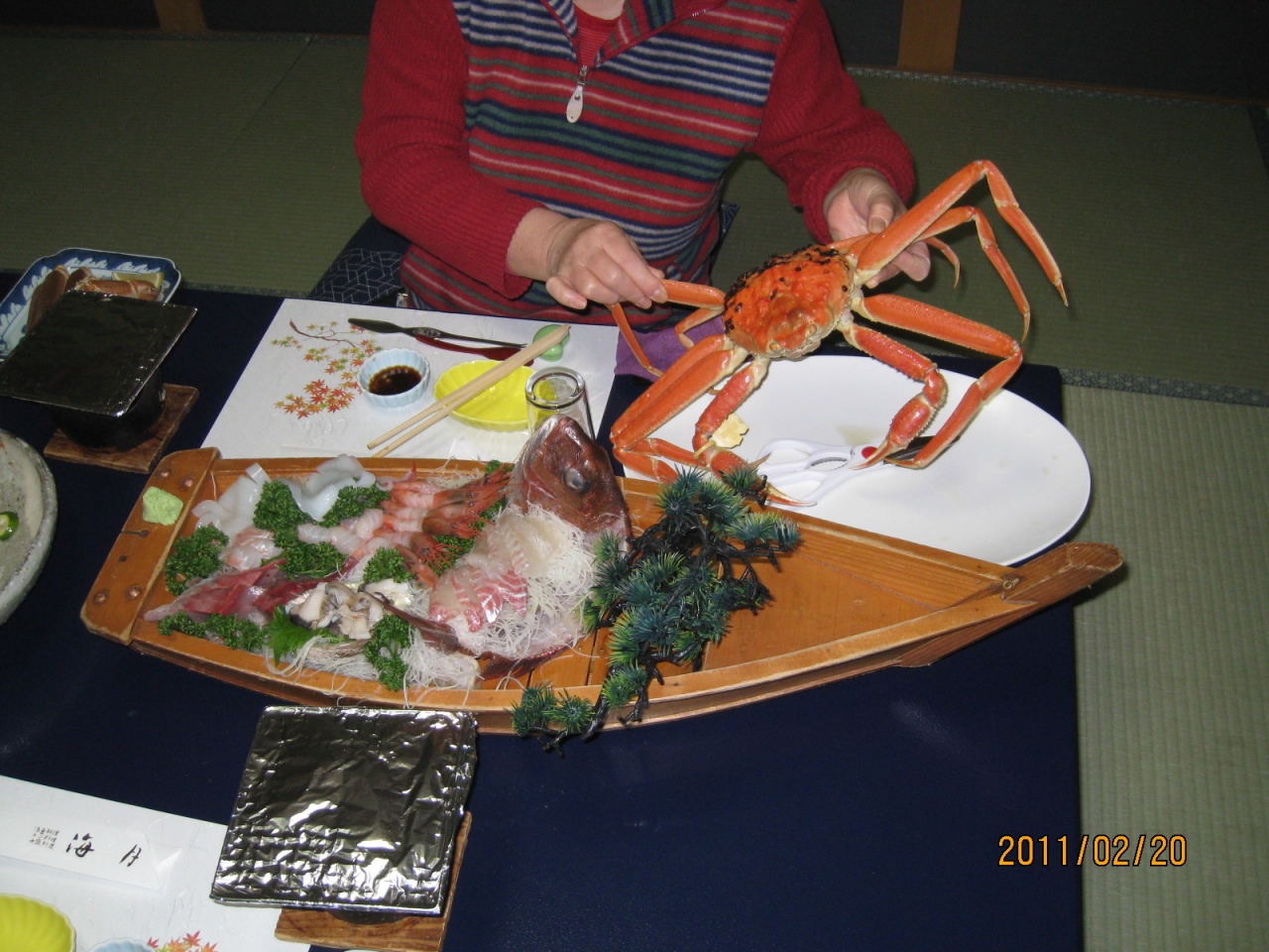 「海月」は、料理旅館でやはり冬の美味 越前ガニがメインで刺身、焼き蟹、湯で蟹、など堪能。更に、新鮮な魚介類の刺身、天ぷらなど腹一杯食べました。