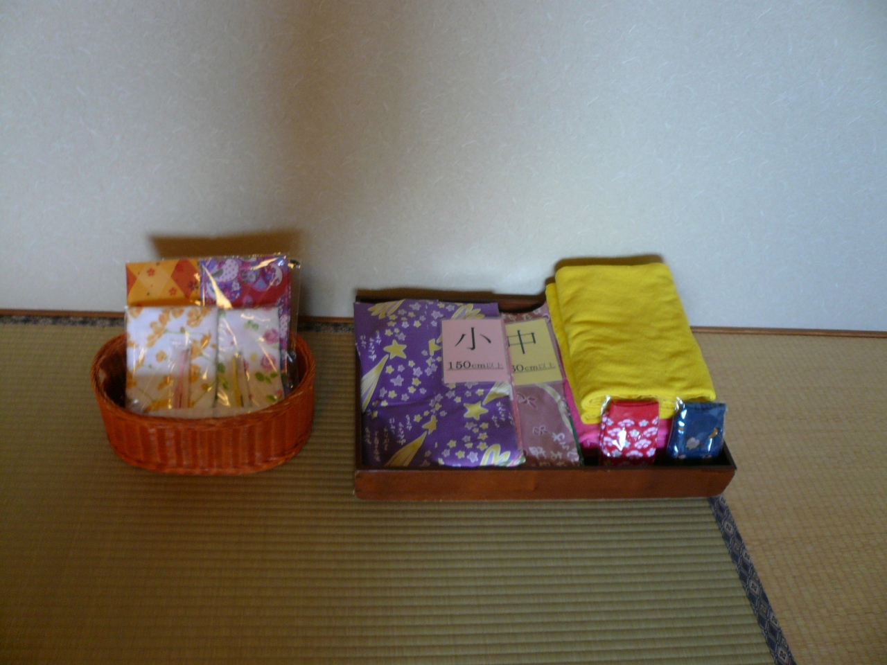 カワイイ柄の浴衣が1人につき2枚、湯足袋やタオルもかわいい柄入り。