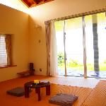 ビーチまではちょっと離れていますが、歩いて5分ぐらいで行けました。部屋は一部屋ずつ離れになっていて、プライベート感があります。全4室で、2棟の建物に2室ずつある造りです。部屋は新しい畳の香りがしてくつろげました。シャワールームにはバスタブはありませんでした。部屋の大きな窓からは朝陽が差し込み、庭の芝生で朝ヨガや座禅をしてくつろげました。