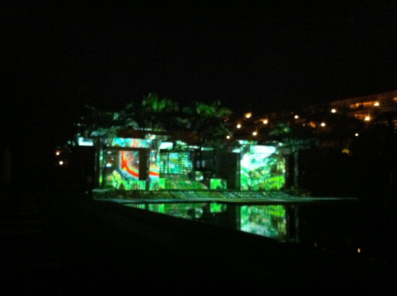 滞在中、ガーデンプールでプロジェクションマッピングが開催されていました。規模は小さいながらも、沖縄らしい映像が広がり、子供たちは楽しそうに観賞していました。混雑もなく、自分たちの好きな場所で自由に観れるのも良かったです。