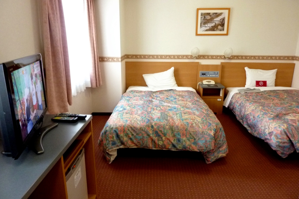 以前も利用したことがあるのでリピーターという訳。この日はツインだったが、部屋が広く、アメニティも充実していた。最上階から三次市内の田園・住宅地帯を見下ろせ、ローカル情緒満点。