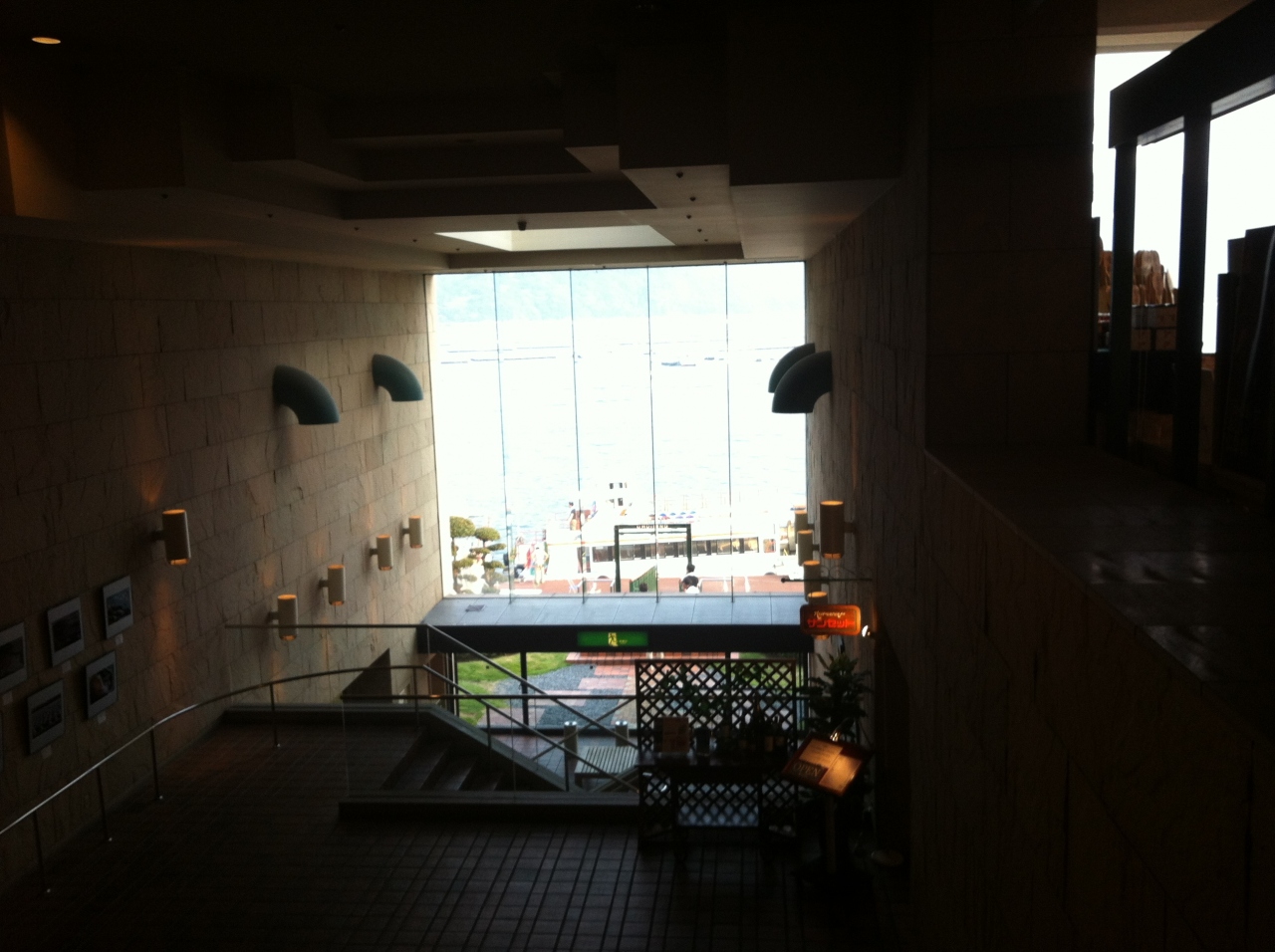 宮島水中花火大会の日には、とにかく混雑します。ロビーは宿泊者以外のお客さんもいてごったがえしてます。花火の観覧船はここの裏手から出発します。ホテルからも花火が見えるので、当日の宿泊予約は1年前くらいからどうぞ!