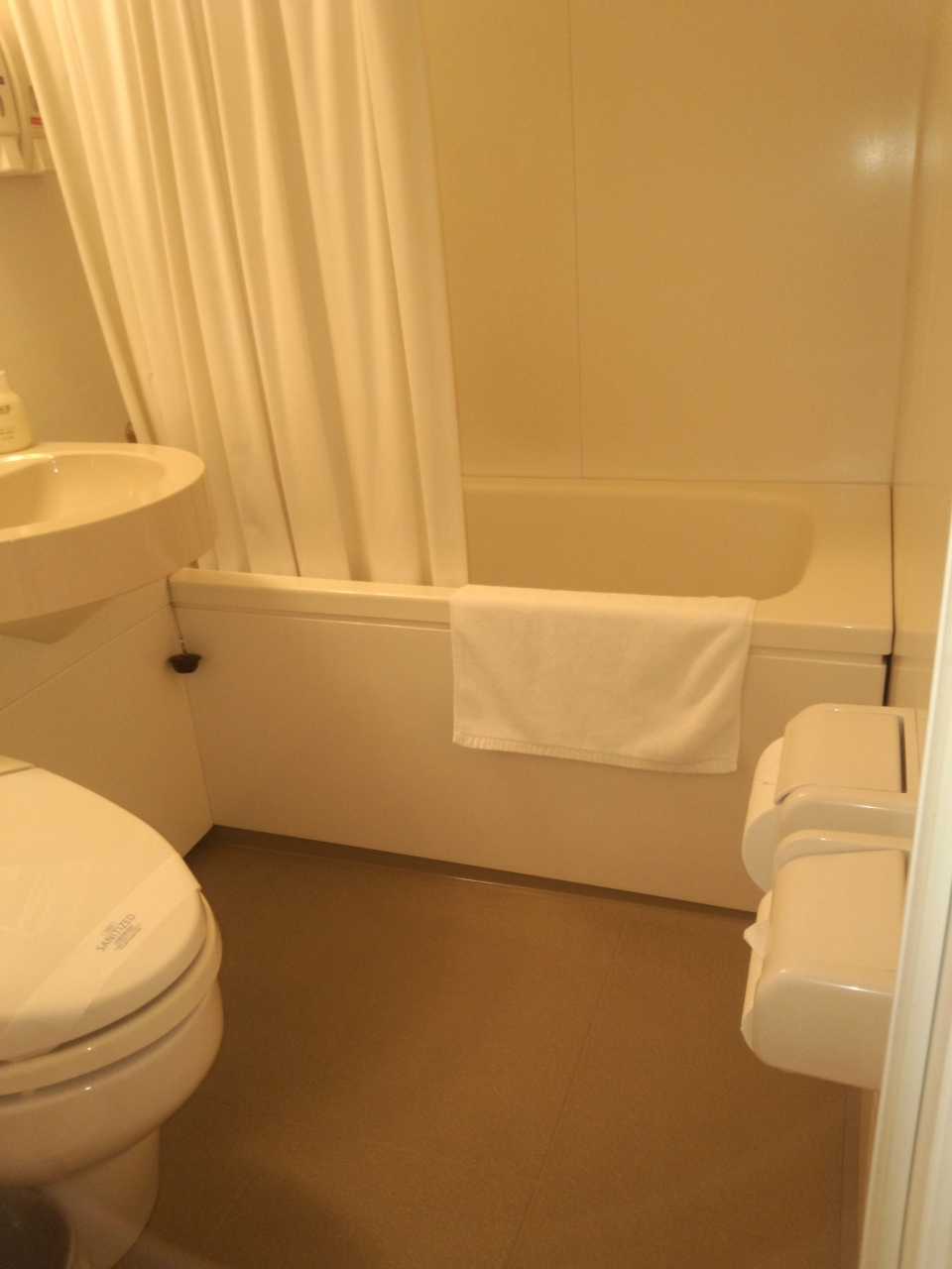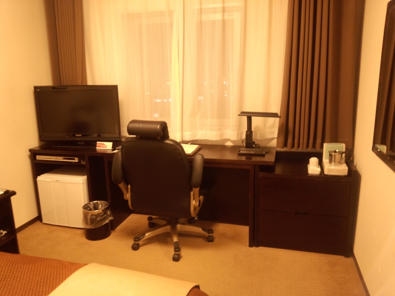 部屋は一般的なビジネスホテルよりも広く,家族連れでも十分荷物を広げられるスペースがあります.浴槽もこの手のホテルとしては広い方だと思います.部屋にはDVDプレーヤーが備え付けられていて,あらかじめ分かっていたら部屋でゆっくりくつろぐこともできそうでした.